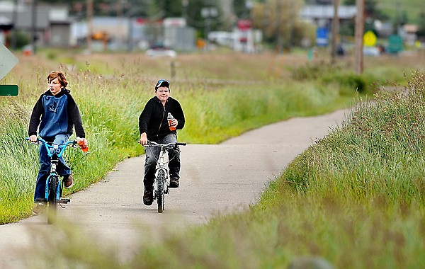 From left, Nikolas Domokos, 13, and Kolby Jones, 10, both of Marion, ride the Great Northern Historic Trail from Kalispell to Kila.