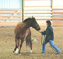 The clinic in February talked a lot about gaining respect on the ground. With horses weighing in anywhere from 1,000 to 1,500 pounds, it’s important that they are respectful to their owner’s space. Tammy Maul brought her horse out.