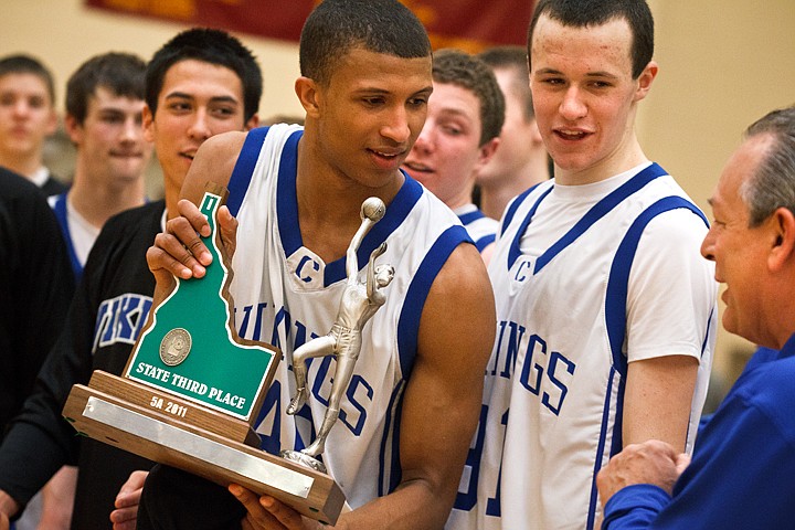 Coeur d'Alene's Deon Watson shares the State 5A third place trophy with his team and coaches Saturday after beating Borah High School 69-51.