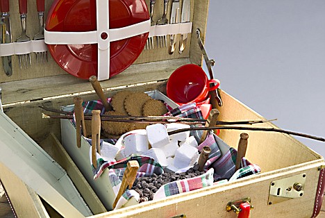 Personally, my favorite part of eating outdoors is the campfire. While I won't endorse piling kindling in the middle of your living room carpet and lighting a match, I will suggest that you try to recreate the spirit of it. Put a dinner plate full of candles in the center of the blanket, and toast marshmallows on skewers for some smooshy s'mores. Don't forget to dim the electric lights and tell ghost stories over the "campfire."