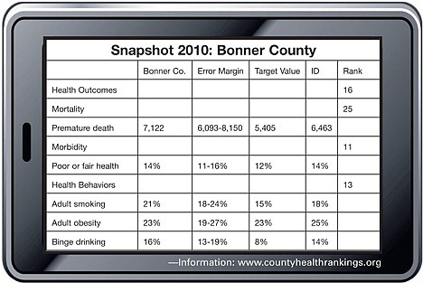 According to a survey conducted by the University of Wisconsin, Bonner County ranks 12 out of 42 counties in overall health, an improvement from its 16th rank last year. By comparison, Kootenai County ranked the highest in the panhandle. Shoshone County ranked the lowest, finishing second to last in statewide ranking and last in factors such as smoking, drinking, obesity, sexually transmitted diseases and impoverished children.