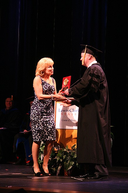 One week later, duly informed, Jaeger walked onto the stage at North Idaho College's Boswell Hall during the Lewis-Clark State (Coeur d'Alene campus) commencement ceremony on Sunday. Don Montgomery, LCSC alumni president, handed her a handsome plaque with her name etched on the front.