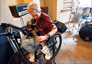 And practicing. Hours, alone, in his studio or living room. He had a keyboard stand custom-made to hold his guitar. It's a bit of a struggle, because he can't push down, but he manages to guide the slide and pick across the strings.