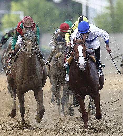 The chestnut colt, who led into the stretch in the Derby two weeks ago, finished the job at 12-1 odds, covering the 1 3-16 miles in 1:56.47.