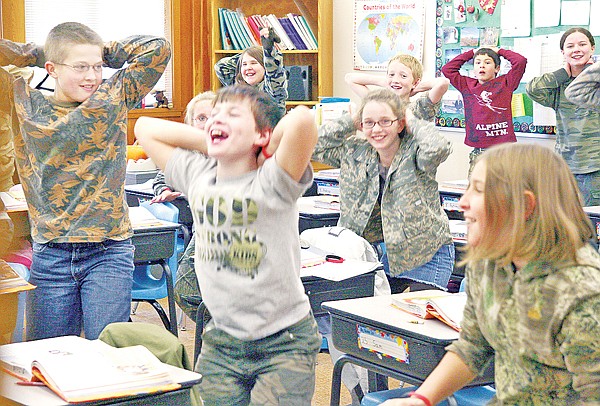 Mr. Bill Moe’s fifth-grade class performed boot-camp exercises in their camouflage to fight drugs.