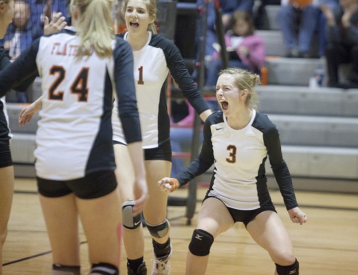 Flathead junior Emily Russell (3) cheers after a point during Flathead's playoff play-in win over Missoula Big Sky Thursday night at Flathead High School.