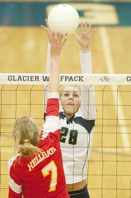 Glacier sophomore Hannah Atlee (28) jumps to block at shot by Hellgate junior Melody McDaniels (7) during Glacier's five set win over Hellgate in the Class AA play-in game Thursday evening at Glacier High School.