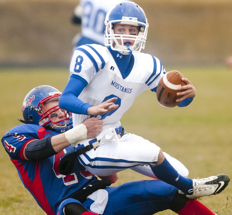 Bigfork's Connor Coleman (45) takes down Malta quarterback Kendall Denham (8) during Bigfork's loss to Malta in the quarterfinal game of the Class B Tournament Saturday afternoon.