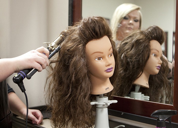 Kimberly Carpenter, a student at the Pela Beauty Academy, curls the hair of a "Molly Head" Monday morning at the Pela Beauty Academy in the Mountain Mall in Whitefish. The heads are made with real hair that is processed to withstand heat.