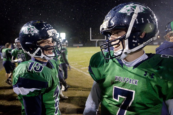 Glacier defensive back Adam Cebulla (15) and quarterback Taylor Hulslander (7) joke on the sideline during Glacier's playoff victory over Billings Senior last Friday night at Legends Stadium.