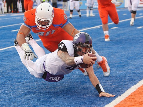 TCU coach Gary Patterson made a gutsy call, opting to put the game in Pachall's hands and go for the lead instead of the tie. It worked. Pachall tossed a short pass to Josh Boyce, who fought his way into the end zone, putting TCU up 36-35 and quieting a raucous Bronco Stadium crowd.