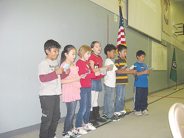 Seven third-grade students recited a poem written by Cheryl Dyson entitled "Veterans Day," which starts, "We honor all, who answered to a service call," and ends with "though we may not know each name, we thank all veterans just the same."