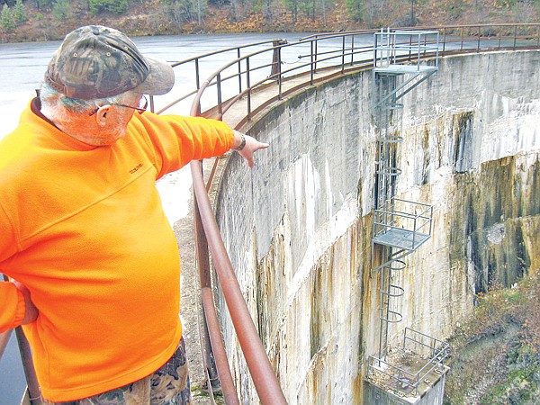 Vic White, director of the Lincoln County Emergency Management Agency, inspected the Libby Flower Creek Dam on Friday just hours after the 3.3 magnitude earthquake rattled areas southeast of Missoula. White, who was hunting on Veterans Day, came into town to inspect the dam, which holds back water that supplies Libby. White found the dam to be secure. In the photo, White points to an area where state officials have done a core sampling of the dam. Those findings have led the state to not renew a five-year term for the nearly 50-year-old curved structure. Currently, the city is beginning excavation about 100 yards below the current site for a new gravity-type dam. In the inset photo is conduit city officials have installed for sensors to monitor water levels. The equipment will include visual sensors and an alarm should water levels vary.