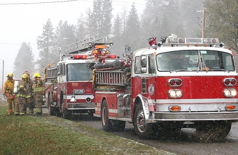 Plains city firemen congregate shortly after putting out the basement fire as a snowstorm approaches.