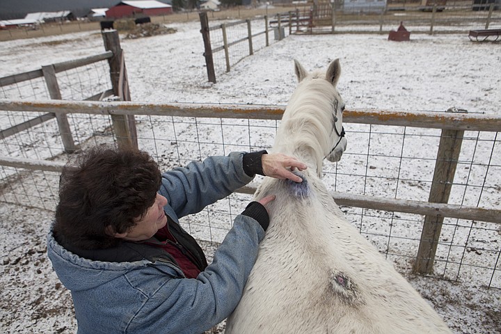 Cheryl Bergerson inspects a large sore on the back of Rosie, an Arabian mix mare she rescued, at her ranch in Columbia Falls Saturday morning.