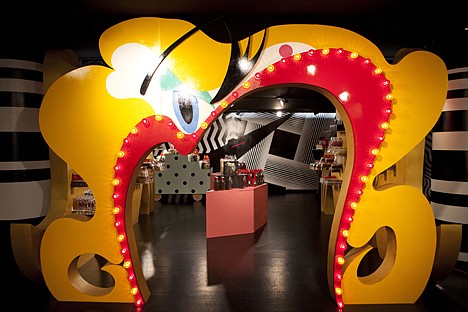 In the candy shop section there are cookies shaped like little monsters (Gaga's affectionate term for her fans) and rock candy necklaces, while inside the boudoir, sort of a tent shaped like a wig, there are hair bows and hologram-effect nail polishes. For toys, there are plush monsters riding a train, and the jewelry store has chunky necklaces and bracelets from Erickson Beamon and Pamela Love.