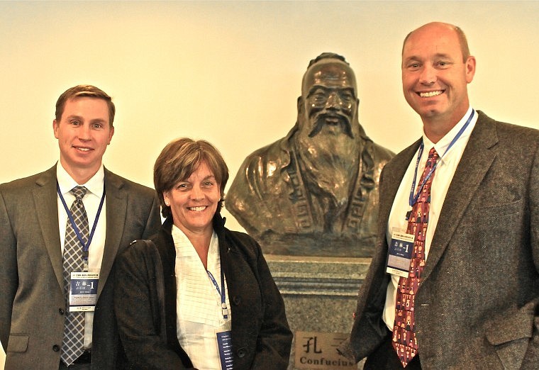From left, Matt Jensen, Ann Minckler and Todd Fiske pose in front of a statue of Confucius.