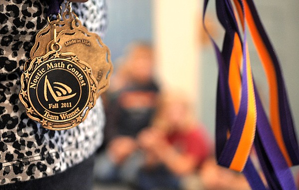 Donna Bryan prepares to give out Noetic Learning Math Contest medals on Tuesday afternoon at Glacier Gateway Elementary in Columbia Falls. Two fourth graders, Noah Golan and Samuel Lovering, were tied for the highest marks in the school and were therefore both awarded medals for being in the top 90 percent and for being team leaders.