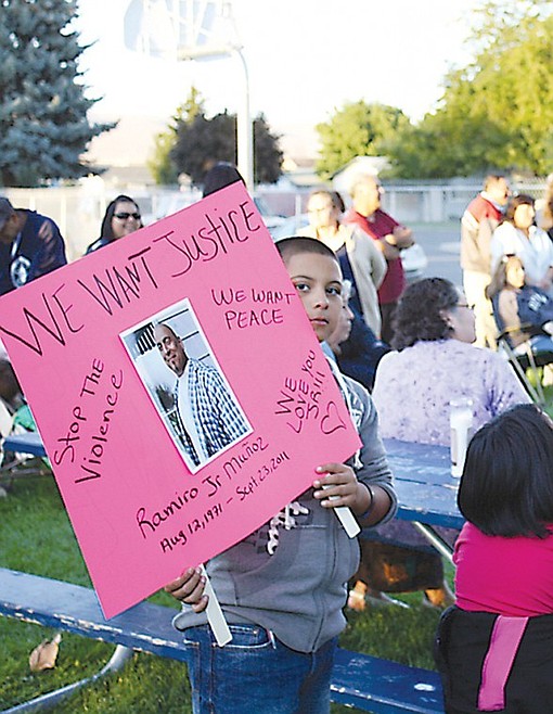 On Wednesday evening four women took turns leading a crowd of about 100 people in praying the Rosary. Many people picked up signs bearing images of Junior and messages for peace written in Spanish and English before lining up behind a Quincy patrol car on C Street.