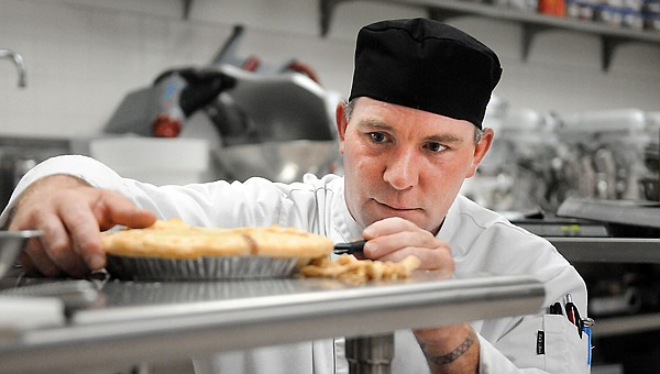 Tony Brown, a first year student in FVCC's culinary arts school carefully trims the crust of a Rum Raisin Apple pie on Thursday evening at FVCC. According to Tara Roth, director of Communications and Marketing for the college, FVCC culinary arts students play a significant role in the FVCC Foundation's Festival of Flavors event. In addition to presenting two Chef's Table winemaker dinners, the students made handcrafted seasonal fruit pies that were auctioned off at the Festival of Flavors kick-off event. The students will participate in the event's conclusion, the Grand Wine Tasting, by joining chefs across the Valley as they present fine foods they created to event patrons.