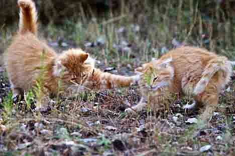 The cats, still hungry, sniff and search the ground, sometimes swiping at each other for the last morsel.