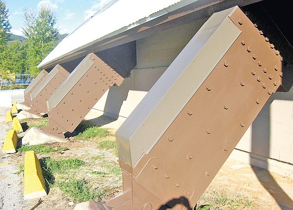 The wooden beams that support the gymnasium roof at Libby High School recently received some reinforcing as the lower part of the beams, which were exposed to the weather, rotted. The beams were strengthened with concrete and the brown flashing was added to protect the beams from the elements. The work was performed as part of the recent renovation of the high school.