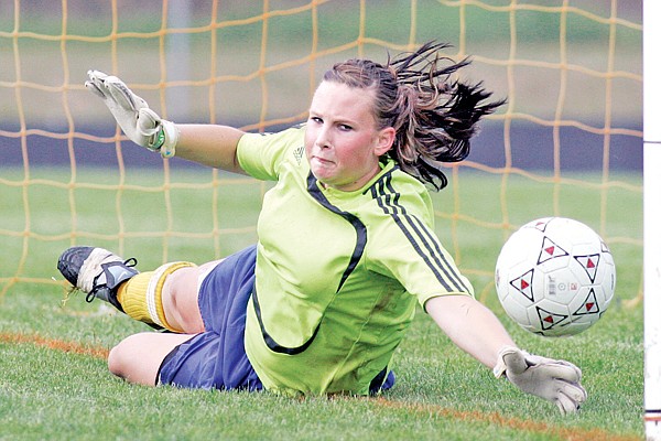 Great effort by Logger keeper Rebecca Kyriss nearly stopping a C-Falls goal on a penalty kick first half