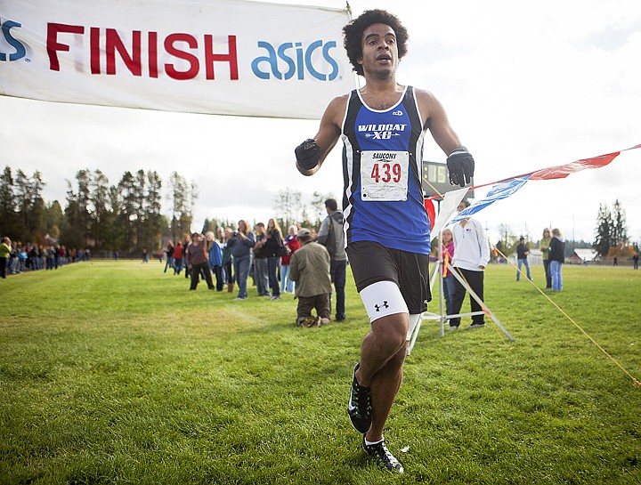 Columbia Falls senior Derrick Williams crosses the finish line in first place at the Whitefish Cross Country Meet on the Whitefish High School Campus Course on Saturday morning. Williams won by 31 seconds with a time of 15:31.