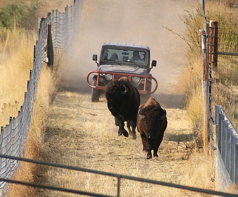 Secondly, horses would have to gain good speed to get the bison moving fast toward the chute. That created danger for the horses, as well as the riled-up bison. With the Jeeps, it’s a different story.