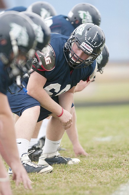 Center Chase Eisenzimer (69) yells calls to the offensive line during practice at Glacier High School on Thursday afternoon.