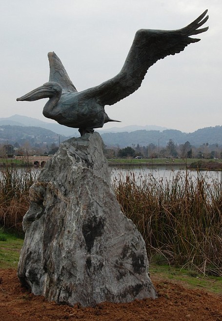 The bronze and stone sculpture is called “Omay,” a Miwok word for pelican, and was sculpted by David Clemons, of Coeur d’Alene. Novato is in the San Francisco Bay area.