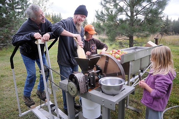 From left, Jeffrey Funk pedals as Seth Axelsen and his 10-year-old son, Daylan, feed apples into a grinder Wednesday afternoon at Funk’s home in Bigfork. Funk made the three-sink bath and grinder to run soley on self-generated power and using items found at the dump. Funk will be bringing the grinder and apple press to the Community Cider Press Saturday at noon on the deck of La Provence in Bigfork. The event, sponsored by the Essential Stuff Project, is free and open to the public. Those who wish to participate are asked to bring containers and rinsed apples.