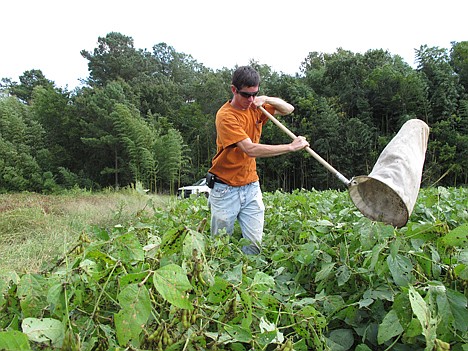 Starting in the middle of the field, Seiter walks down a row, sweeping a canvas net back and forth through the bean plants as he goes. Bugs cling to his pants and shirt, dotting his face like moles.