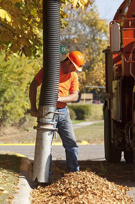 Kalispell city worker Mike Nelson cleans up leaves off the side of East Washington Street Tuesday afternoon.