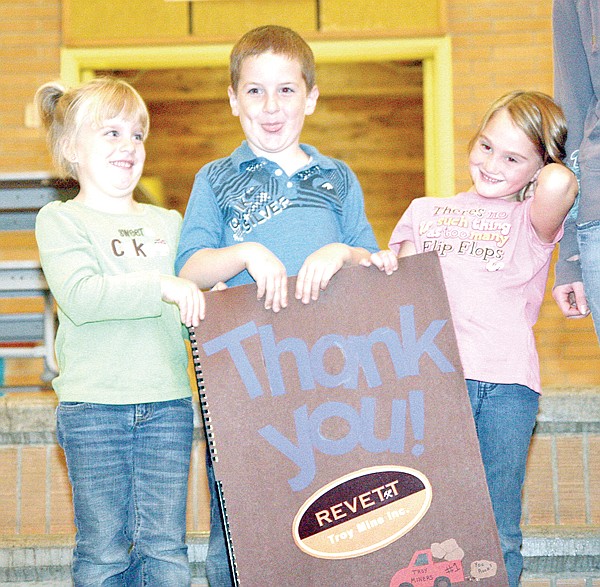 Students at Libby Elementary School got the opportunity Tuesday to thank Revett Minerals and the Troy mine workers for a school contribution totaling $8,000. Revett facilitated LES with gravel for the playgrounds and moved the playground equipment for the students. For approximately 197 workers at the mine, the contribution is about $40 per worker. Left, Mylie and Chase Rayome, Cora Byrd, Michelle Byrd, John Byrd (miner) and Kenny Rayome (miner).