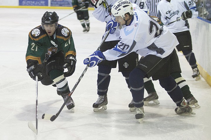 Nationals' forward Austin Givens (21) stretches for puck during the Glacier's loss to Vancouver Thursday night at the Stumptown Ice Den.