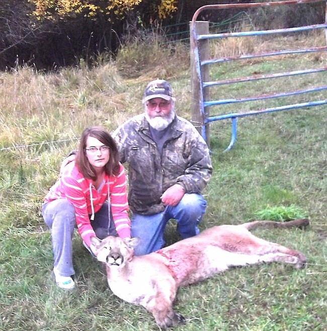 Barbara Steward and Jim Moellman pose with a mountain lion Moellman shot Saturday after the animal kept coming onto the Steward's porch.