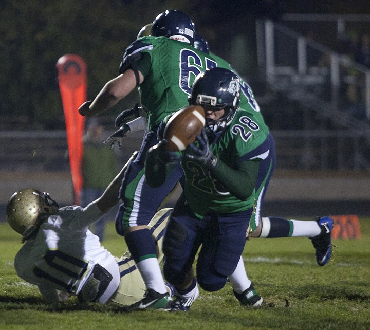 Glacier junior running back Aaron Mitchell (28) dives into the end zone for the Wolfpack's second touchdown Friday night at Legends Stadium.