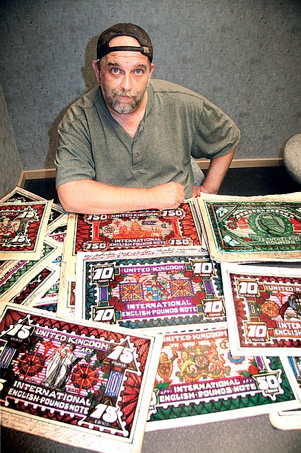 The Post Falls man spreads out the colorful array of artwork doubling as currency on a table. There's fives, 10s, 25s, 50s, up to 500-pound notes, a combination of reds, greens, blues, yellows, golds, whites and blacks. Some are decorated with unicorns or lions. There are shields and knights.