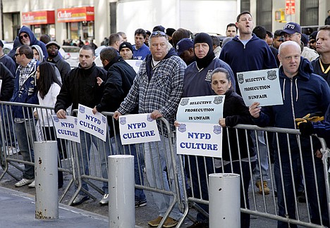 Hundreds of union members went to support the officers, some in suits, others dressed in jeans and sweat shirts, clogging the street near the Bronx courthouse, filling the hallways and applauding in court after the officers left. Detective Steven McDonald, a city hero paralyzed decades ago, was in the courtroom in a wheelchair, with an American flag on this lap.
