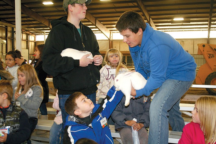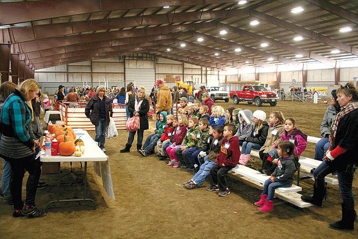 The first graders overtook the Kenny Ardell Pavilion at the Grant County Fairgrounds where Moses Lake High School students delivered presentations on such topics as rabbits, hay, and pumpkins.