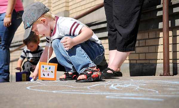 Austin Saunders, 4, of Kalispell and other children work on thier chalk master pieces on the sidewalk south of the library on Wednesday afternoon in Kalispell. The kids were all participants in Story Time which takes place Tuesdays and Wednesdays at the library at 11 a.m.