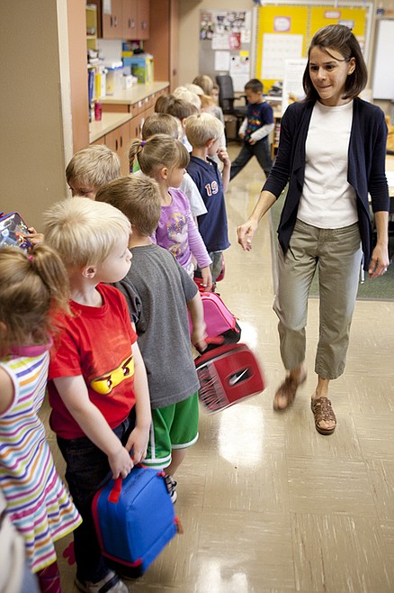 Peterson Elementary School kindergarten teacher Lindsey Bushnell gets her class of 25 students ready for lunch on Friday morning.