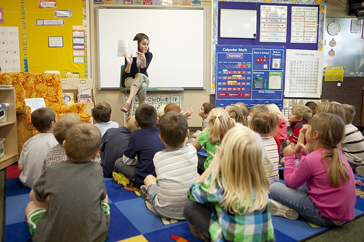 Lindsey Bushnell reads “Dinosaurs before Dark” to her kindergarten class of 25 students at Peterson Elementary School Friday morning. Kindergarten enrollment in Kalispell Public Schools this year is up 14 percent over last year.