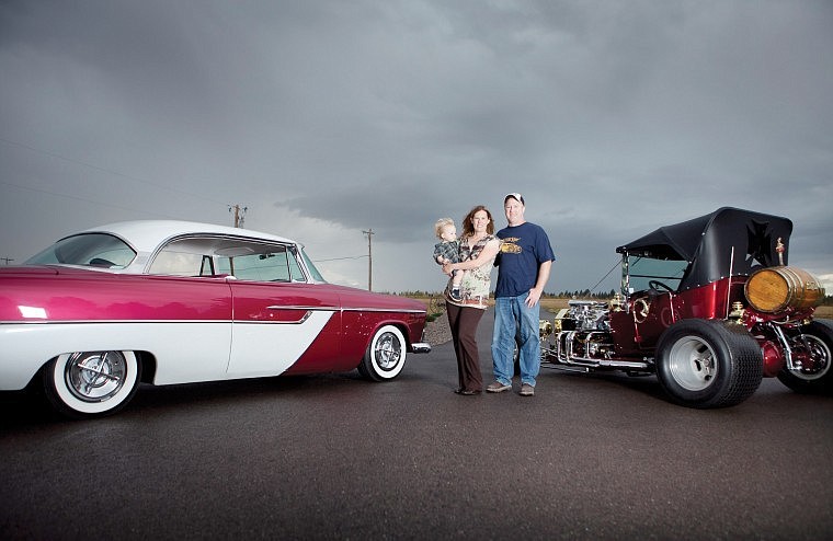 Mark and Tina Colby, with their son Carter, recently won awards at a hot rod show in Spokane with their 1926 Ford Model T roadster, right, and 1955 Plymouth Belvedere.
