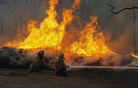 Firefighters lined up on a state highway outside Bastrop and converged around homes as they caught fire, hoping to save them. Helicopters and planes loaded with water could be seen flying to and from the fire. When winds increased, flames would flare up and pop out over the tops of trees.