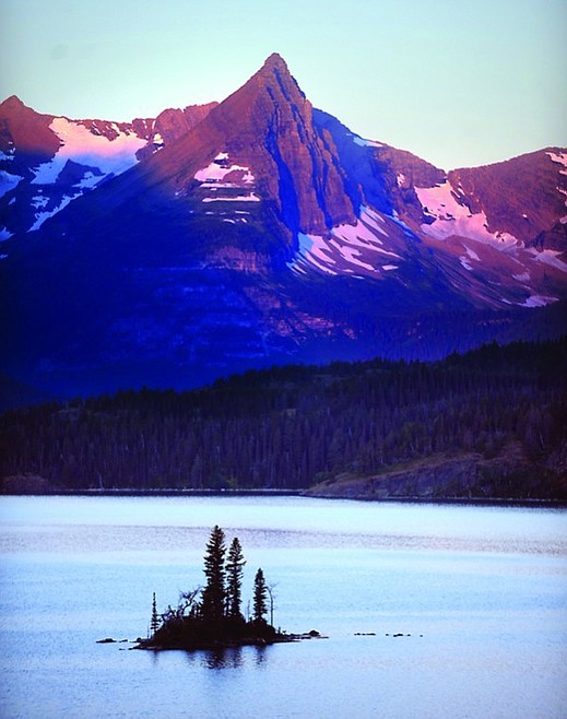 Wild Goose Island is silhouetted against St. Mary Lake as sunrise begins to brighten the peaks in the distance.