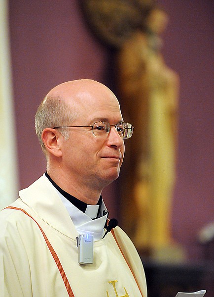 Father Rod Ermatinger of Saint Matthew's gives the homily at mass on Friday morning in Kalispell. Follow mass Father Rod, and students, staff and family members processed from the church to the Kalispell Fire Departmetn carrying 343 flags honoring the first responders killed during the 9/11 attacks.