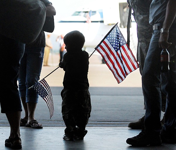 Bransen Holzer, 3, of Libby waves flags at the home coming of his father Staff Sgt. Brandon Holzer on Friday afternoon at Glacier Park International Airport.