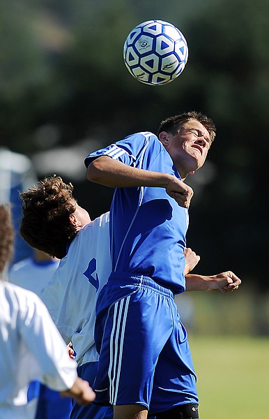 <p>Stillwater sophomore Skyler Rieke, 9, wins a header during the